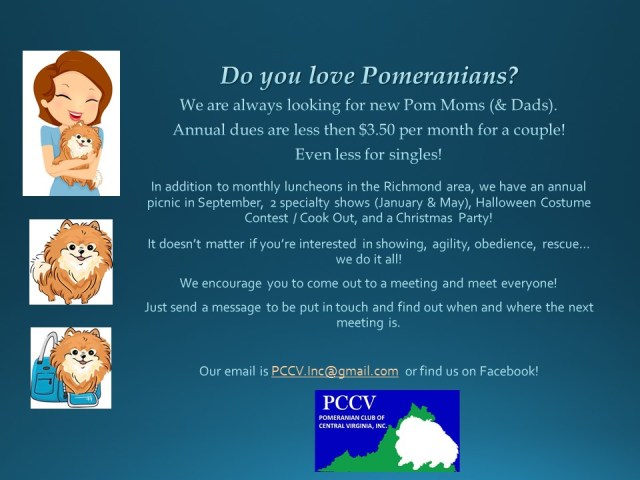 You also get access to our Secret Facebook Group for Members Only! Discover more from Pomeranian Club of Central Virginia Subscribe to get the latest posts sent to your email. Type your email… Subscribe Share this: Click to share on Facebook (Opens in new window) Facebook Click to share on X (Opens in new window) X Click to share on Pinterest (Opens in new window) Pinterest Click to share on LinkedIn (Opens in new window) LinkedIn Click to share on Nextdoor (Opens in new window) Nextdoor Click to share on Reddit (Opens in new window) Reddit Click to share on WhatsApp (Opens in new window) WhatsApp Click to email a link to a friend (Opens in new window) Email Click to print (Opens in new window) Print Like Loading... Related
