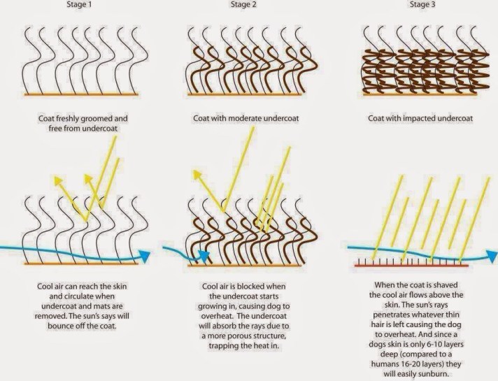 The topcoat is made up of tougher guard hairs that don’t shed, and protect your pet from the sun’s harmful rays and bug bites. It actually insulates them from the heat. What this means is: do not shave your double coated dog. It’s a mistake to think you’re helping your animal stay cool, particularly in summer, when evolution has provided them exactly what they need to survive. By stripping them of their natural ability to heat and cool themselves, you could be doing more harm than good.