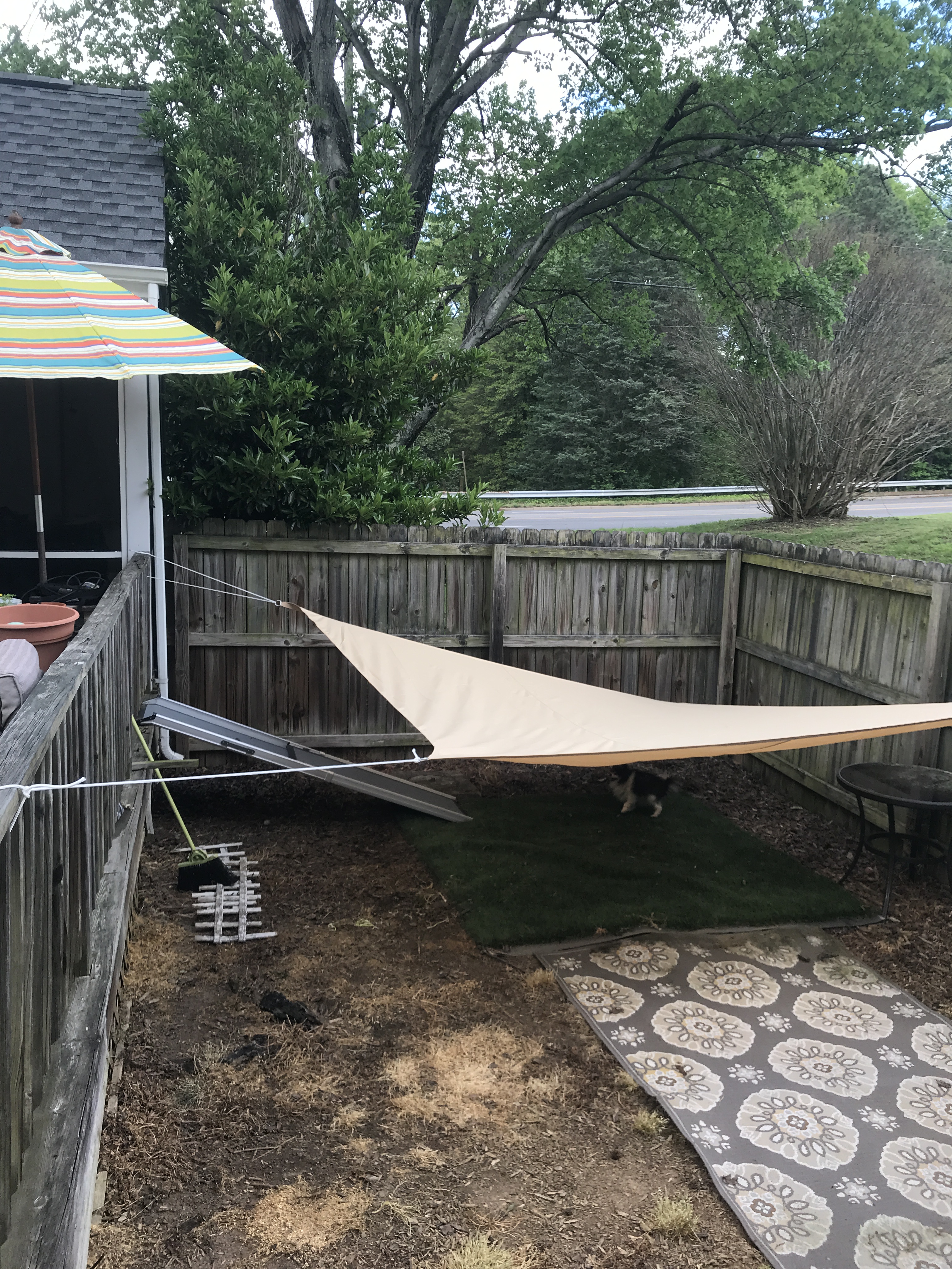 - Install shade/rain cover waterproof sails. Position patio umbrellas to shield path from doggie door to ramp. (we have a couple of umbrellas in various conditions. We are going to try and resurrect a couple).