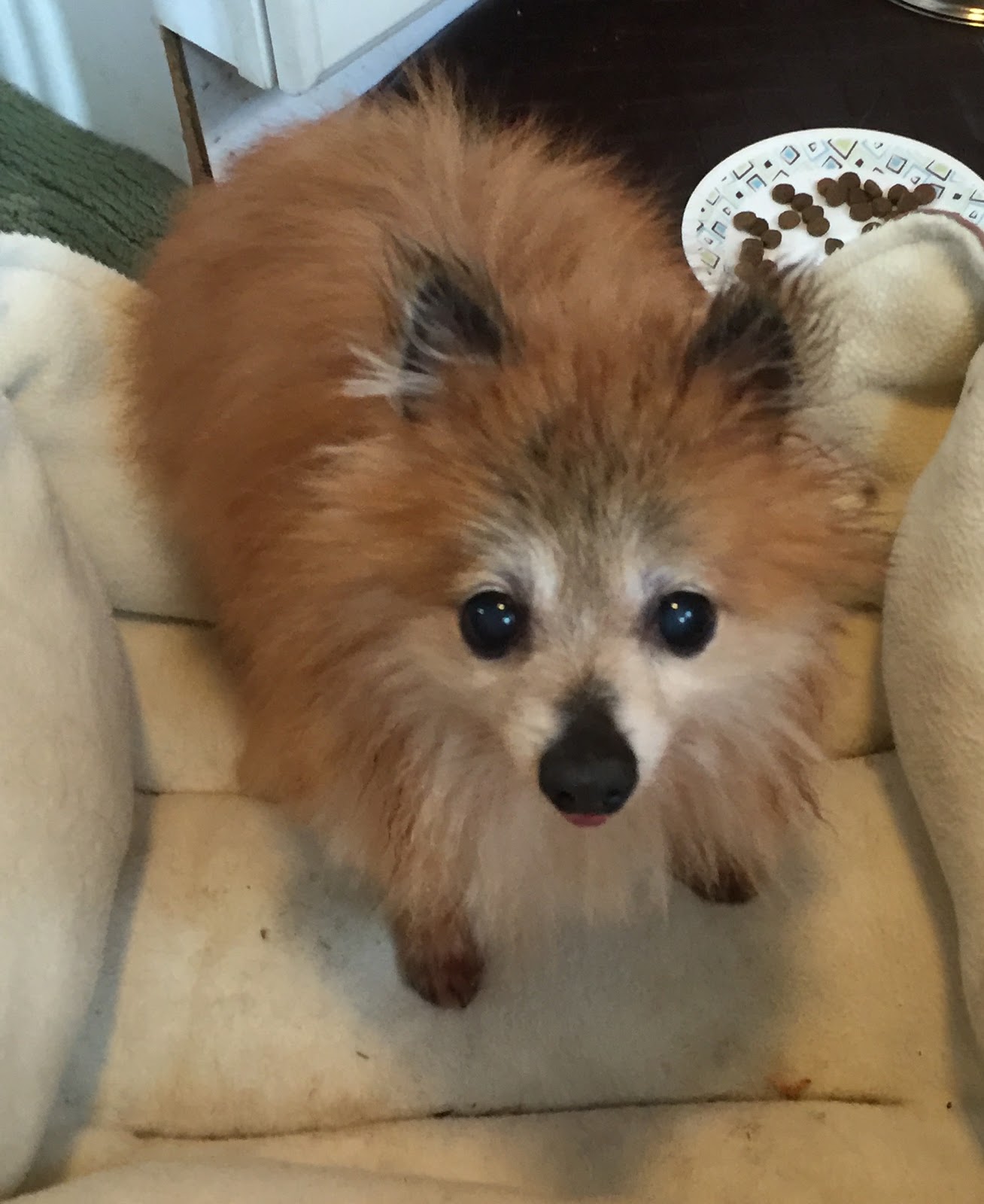 He obviously should eat soft food, but he does grab kibble from the other dogs bowl. He was an even 7 lbs at his vet visit, but I can tell that he has been gaining weight since he’s been here. He was covered in fleas when he came, which I’m sure was the cause of some of his coat loss, but his coat has been coming in thicker in the last month as well.
